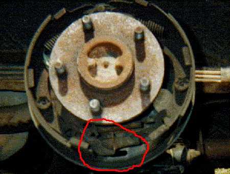 on my XJ works backwards from any other adjuster I have seen. It moves the little star wheel UP to tighten the brake shoes to the drum. I tried to get a good picture of the adjuster¸ this is the best I got. In the red circle is the adjuster (the litle finger that looks like it would pull up on the star wheel) and the star wheel (that thingy with the ridges all around the outside of it). The adjuster finger is supposed to be pulled by the little wire you will see in there when the shoes are forced into the drum. If it moves far enough it will move the little star wheel one notch and move the shoes out against the drum. Take a close look at yours and see which way the star is turned by the adjustment finger¸ that will be the tighten direction. NOW remember that you will be working on the other side¸ so think which way you will move the adjuster from under your car. |