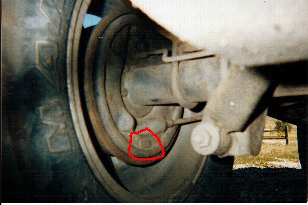 OK¸ now put the drum and tire back on. You will need the tire on to spin the drum against the shoes. Under the car you will find this rubber plug in the adjuster hole. If you have no plug when you are done with adjusting your brakes run down to the local auto parts store and buy one. They keep the mud and stuff out of there which keeps the works from gumming up and not working. |