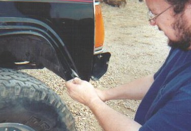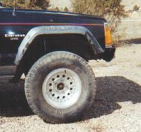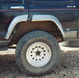 I relocated the stock flares to the new openings. I put the bottom of the flares even with the sheetmetal. The way they are mounted stock¸ the flares stick 1¨ below the edge of the sheetmetal. I also reattched the stock fender liner to help keep the road muck contained. |