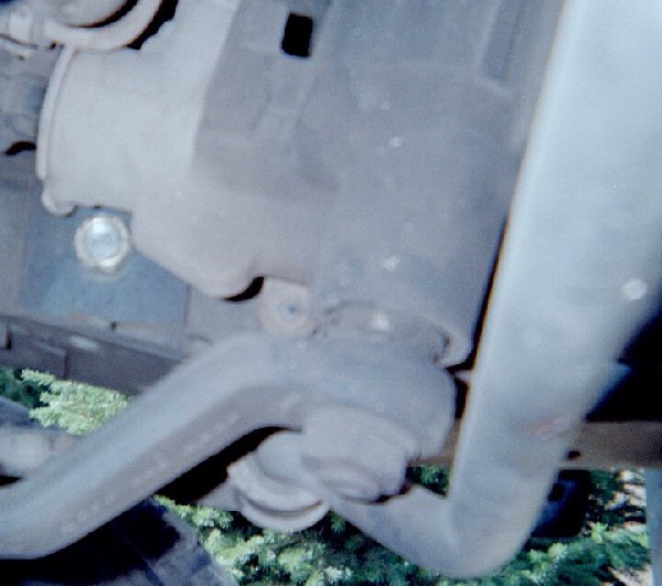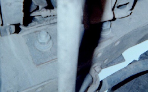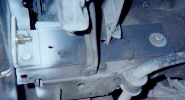 On the inside of the frame I used some 3/16 th inch plate so the bolts I provided would not just bend the unibody, but transfer the force over a little bigger area to clamp it all to the frame. On this side the power stearing box was in the way, so the plate is only for the one bolt. All bolts are grade 8, the one you see here is 5/8 inch. | ![]() |