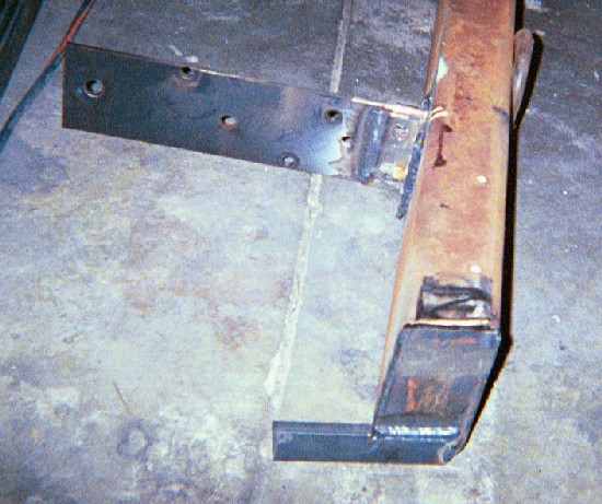 Here is the brace on the passenger outside. Here you can also see the 1 1/2 by 1/4 inch angle I used to attach the box to the reinforment plates on each side. You can also see that I bolted eveything together before I got it welded. That was for two reasons, because of my schedual I had a hard time getting together with someone to weld this up for me. I also provided some streangth and allowed me to run the bumper on the car before I got it welded. I ran it bolted only for three months. | ![]() |