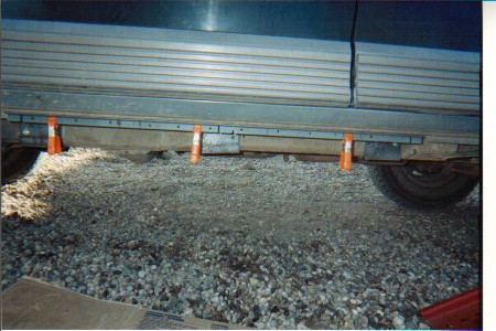 While thinking about this design¸ I thought that the piece of angle iron that I had running from one frame support to the other was too long. Even with 1¨ angle with a 1/4¨ wall, my weight would be able to bend a piece supprted 46¨ apart. If this piece is supposed to transfer the load from the rock rail to the frame (right at the body pinch seam) then it needed more streagth or more support. So I am now working on a design with three supports per side instead of two. The other thing about this design is the piece(s) of angle I am using to pinch the body seam to the rock rails. I deciede to use four seperate pieces for the purpose because there are some bulges in the body seam. That picture is a little lower on the page. If I had only used a one piece pinch¸ then it would really only touch the body seam in three places instead of all along the leangth of the seam. At least with the four pieces¸ it will touch for most of the length of the seam.
