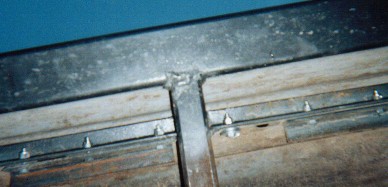 Here is another look at how I bolted the rails up to the pinch seam. You can also see here that the angle iron on the frame side is in several pieces to go around the bulges in the pinch seam. |