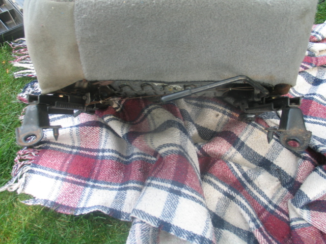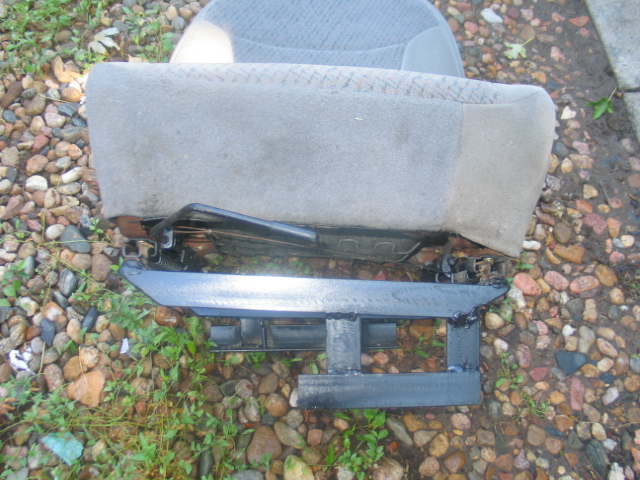 Anyway I did find a couple of good candidates. I found a Dodge Caravan with some nice seats, and thier base is very low profile, the adjust mechanisum unbolts from that really high base there are mounted on. Unfortunatly, the passenger side seat had a huge rip in the back. There was a nice Ford Escort with the top cut off there too, it's seats were in good shape, and they looked like they would fit the bill, so home they came.