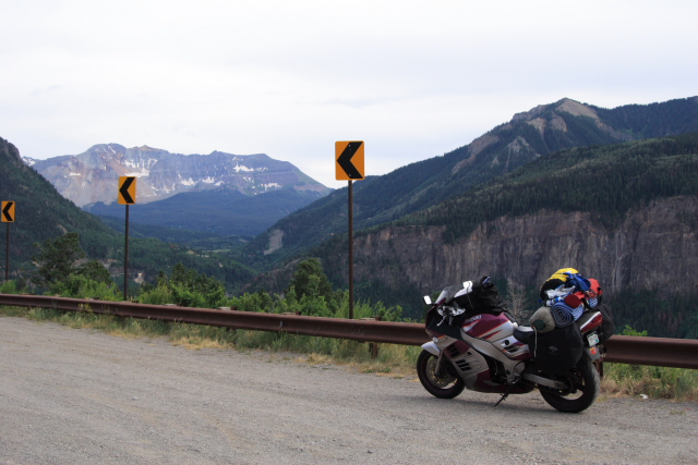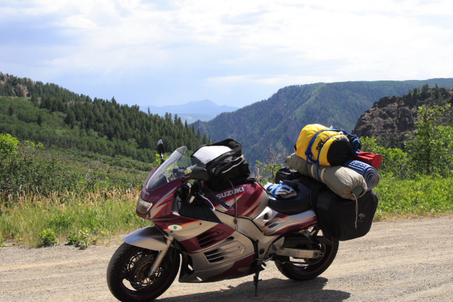 | Left the house later than I wanted to, 9:00. I-25 went fine, but there was a lot of construction on I-70. Had to stop and put the rain gear on, rained on some, but it stopped before I reached Glenwood Springs and I started getting warm. Had Lunch in Glenwood Springs, took the rain gear off again. | |
