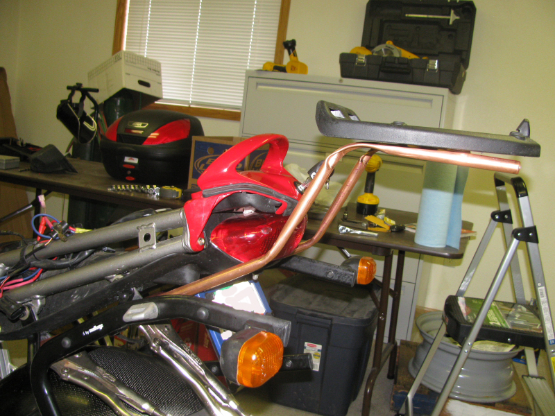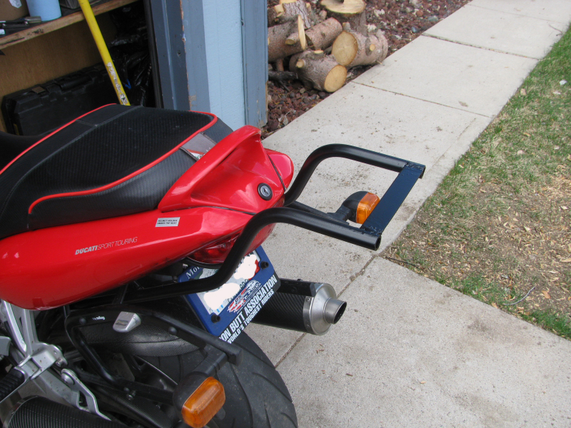 | No more in process pics. After I had it welded up, I sent it out to be powder coated, time to mount it now. The tabs for the trunk mount go inside of the mounts for the side bags. |