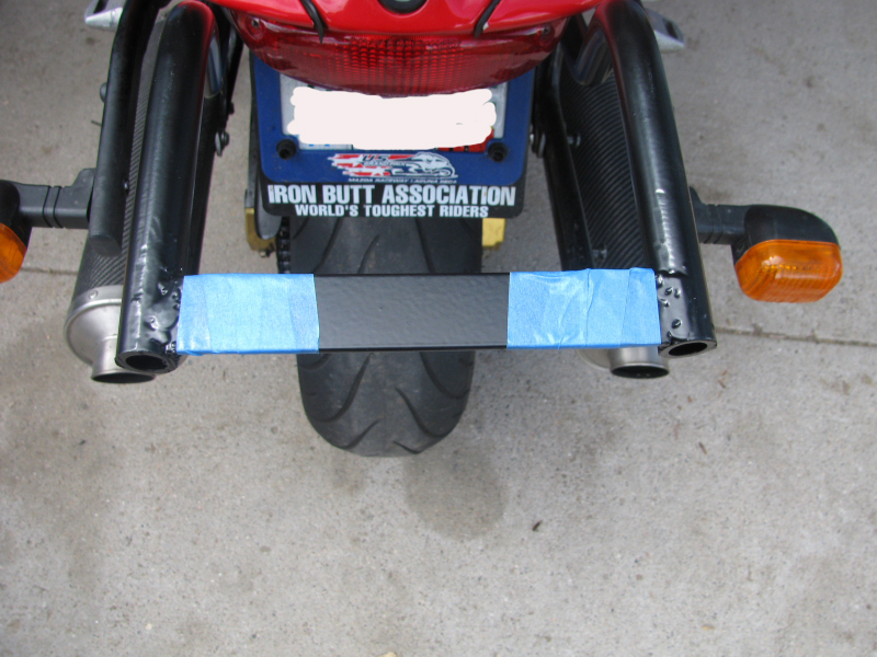 | The powder coat shop said to tape the powder coat so I don't scratch it while drilling the holes. I drilled holes in this cross piece for the rear bolts on the Givi platform. I used the Givi clamps for the front mount. Doing this part I saw that I was not perfect in lining everything up when I welded this. I lined the platform up with the bike and center-punched where the holes went and drilled them. When the holes were drilled you could see that this piece was not perfectly squre to the bike. |